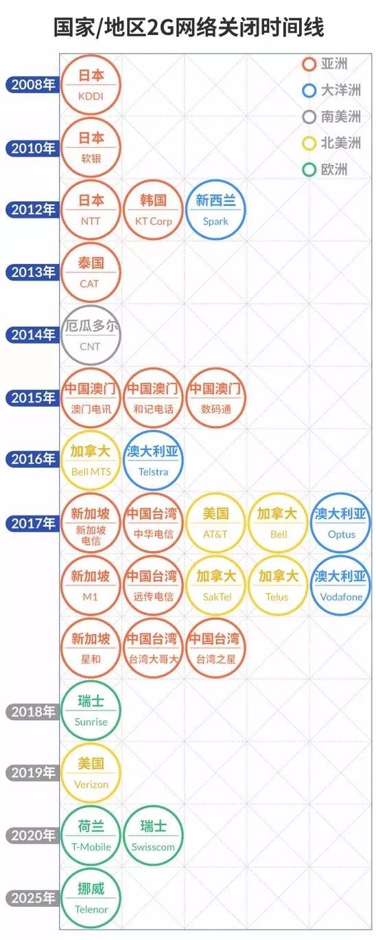 近年來,全球電信運營商對2G/3G網(wǎng)絡(luò)退網(wǎng)動作頻頻。早在2008年,日本KDDI便已經(jīng)對2G進行退網(wǎng);2016年,澳大利亞電信已經(jīng)進行了2G退網(wǎng);Verizon(威瑞森電信)也將在2019年實現(xiàn)2G退網(wǎng)。