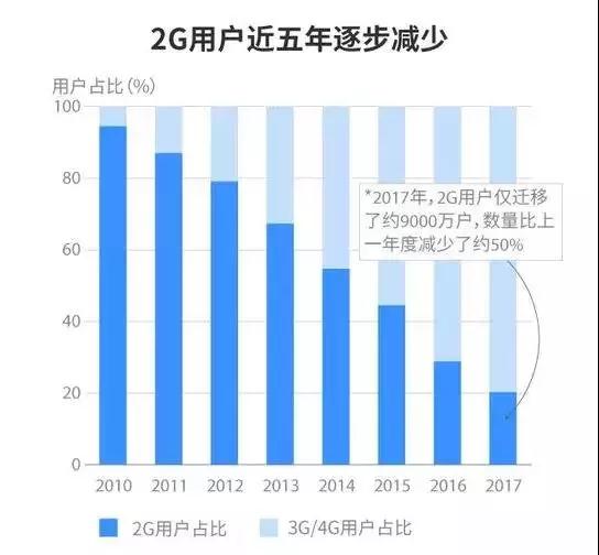 據(jù)2017年三大運營商財報顯示,中國移動4G用戶6.5億人,中國電信4G用戶1.82億人,中國聯(lián)通4G用戶1.75億人。而三大運營商的2G和3G用戶人數(shù)加起來共有3.99億,其中有3億人左右的是2G用戶,占比75%。